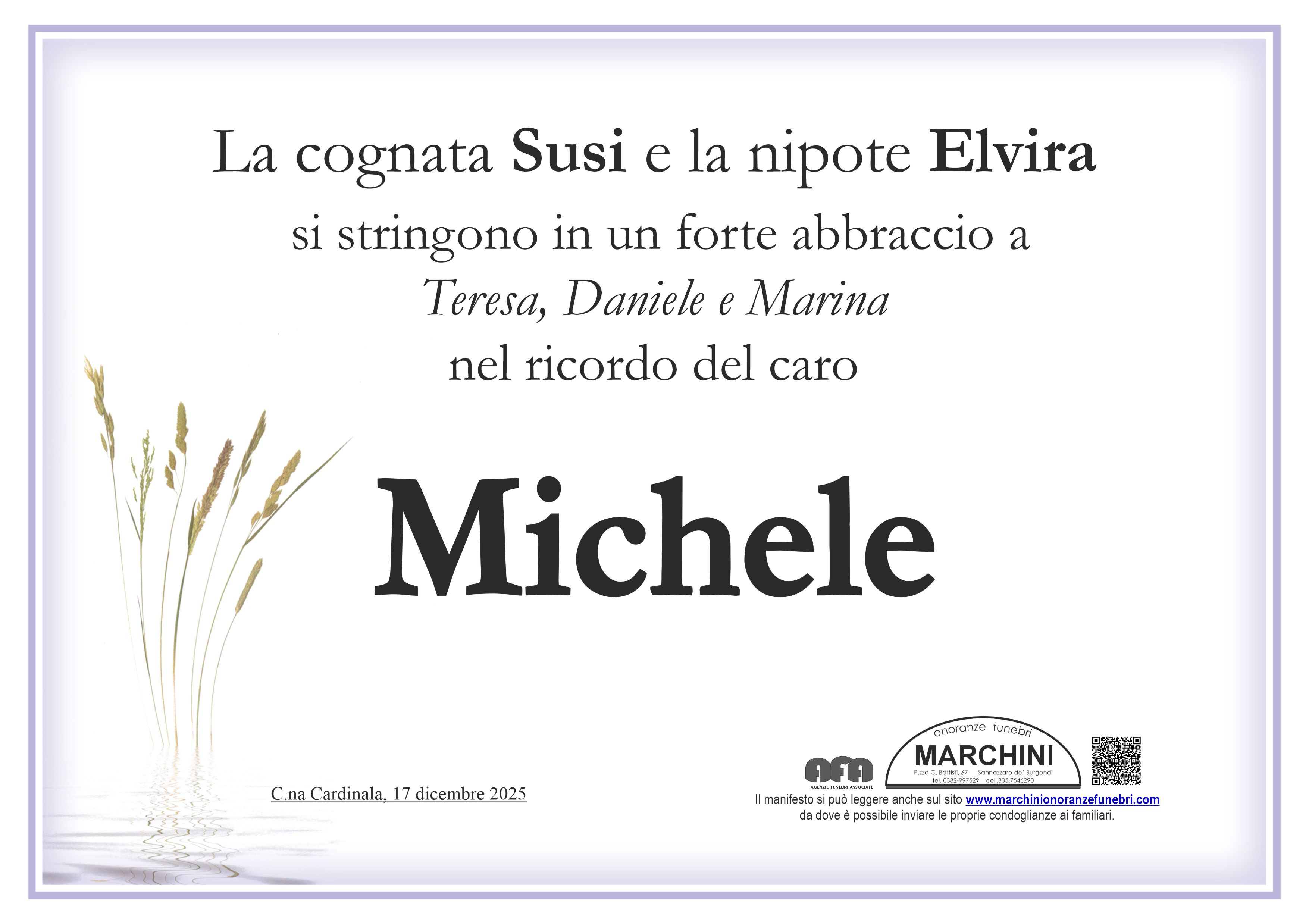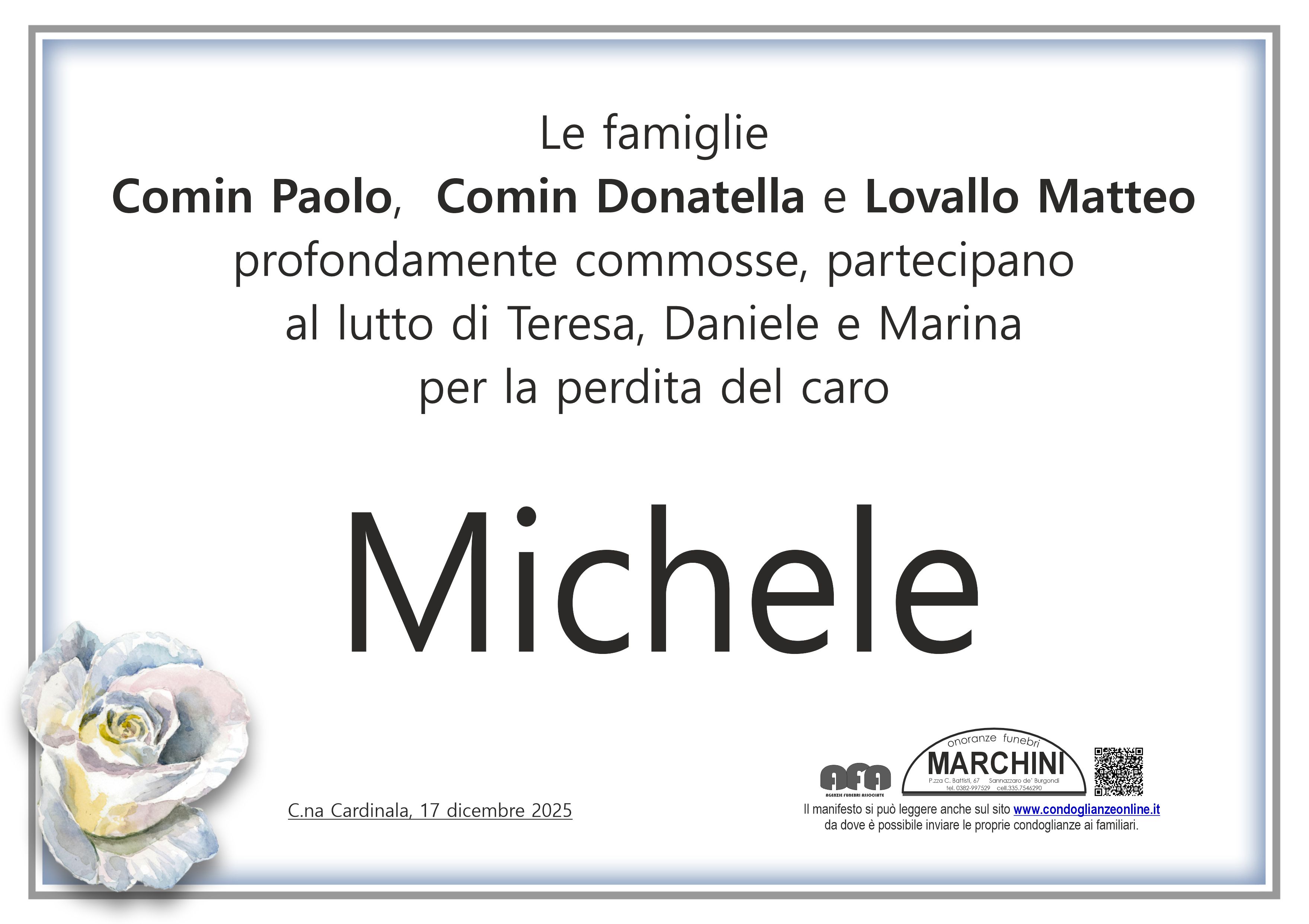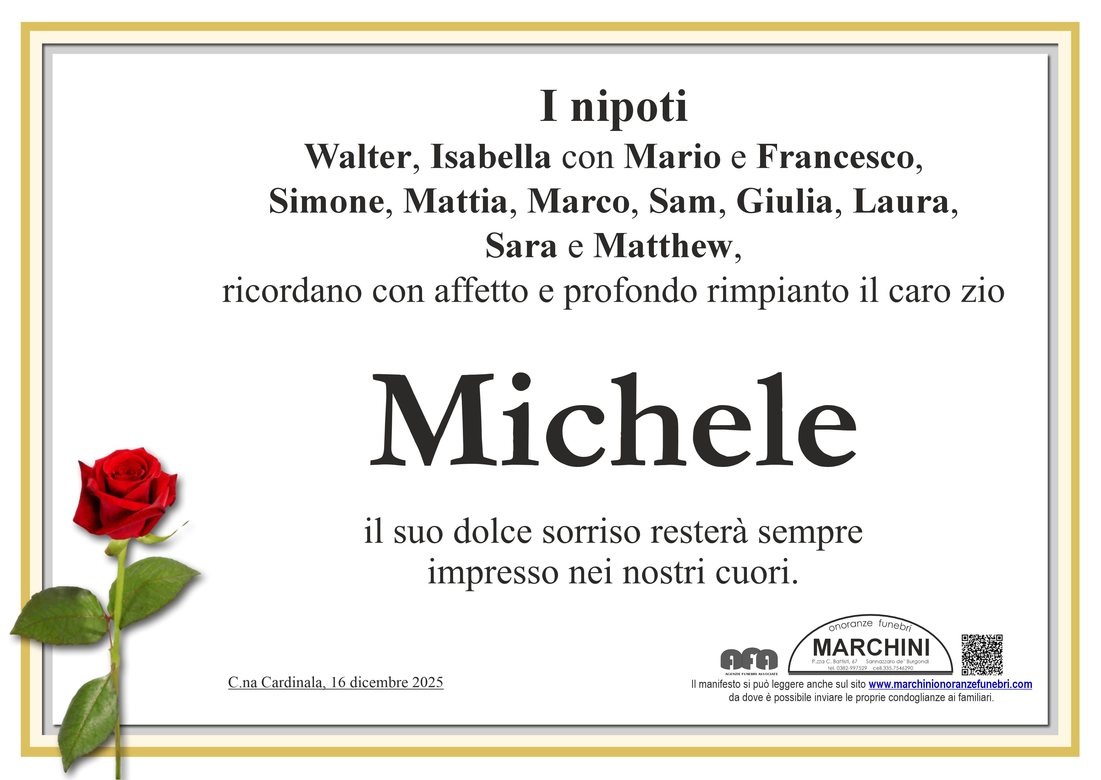 Sentite condoglianze a tutta la famiglia. Vi sono vicina per la perdita del caro Michele. Ciao Michele, ricorderò sempre la tua allegria. Pavesi Monya